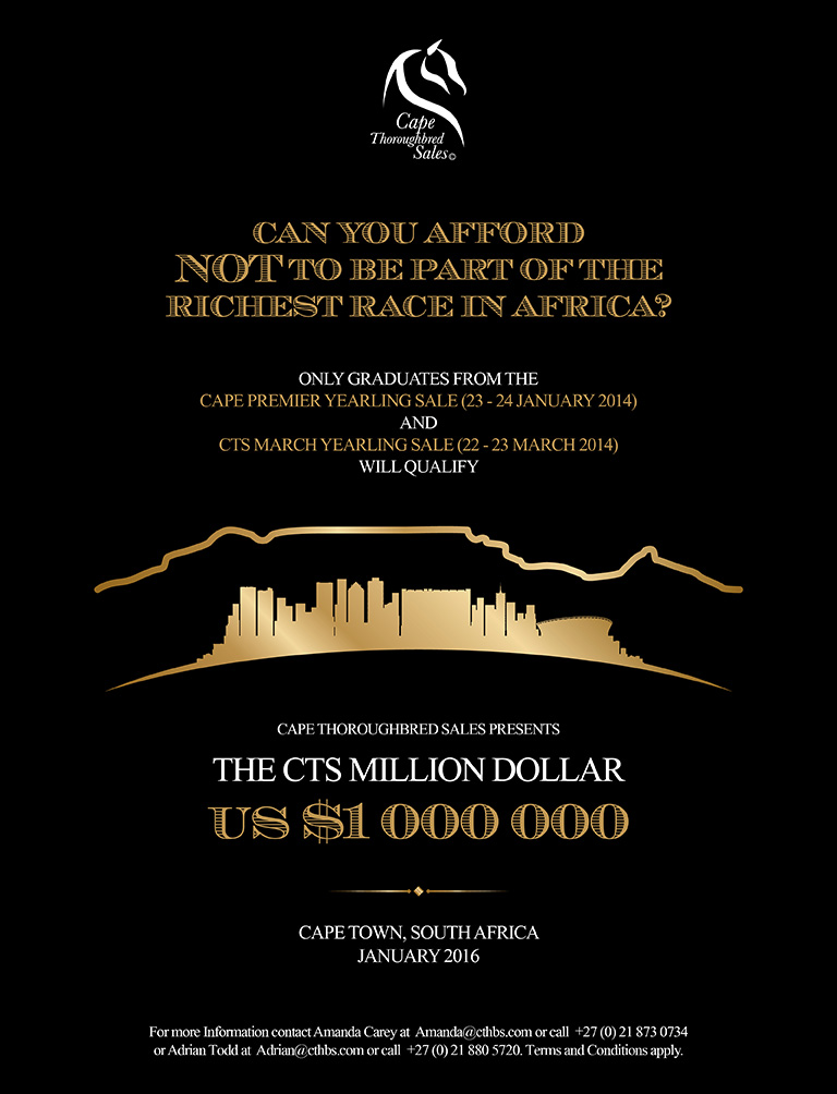 The first Million Dollar race in the history of South African racing is scheduled to be run over 1400m at Kenilworth Racecourse in January 2016 and will only be open to graduates from the 2014 Cape Premier Yearling Sale and the 2014 CTS March Yearling Sale.